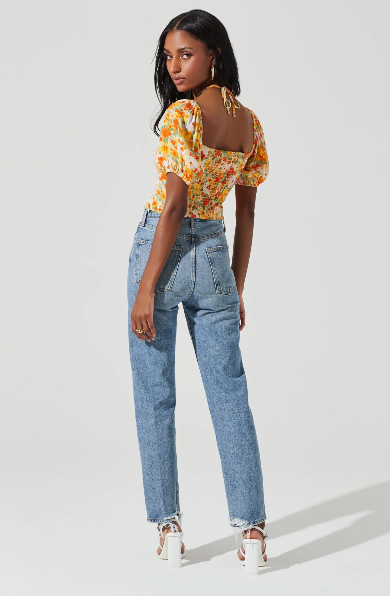 This bright floral top features a halter tie neck accent that leads to a sweetheart neckline. Front cutout accent. Ruched front. Short puff sleeves. Smocked back. Concealed side zip closure.