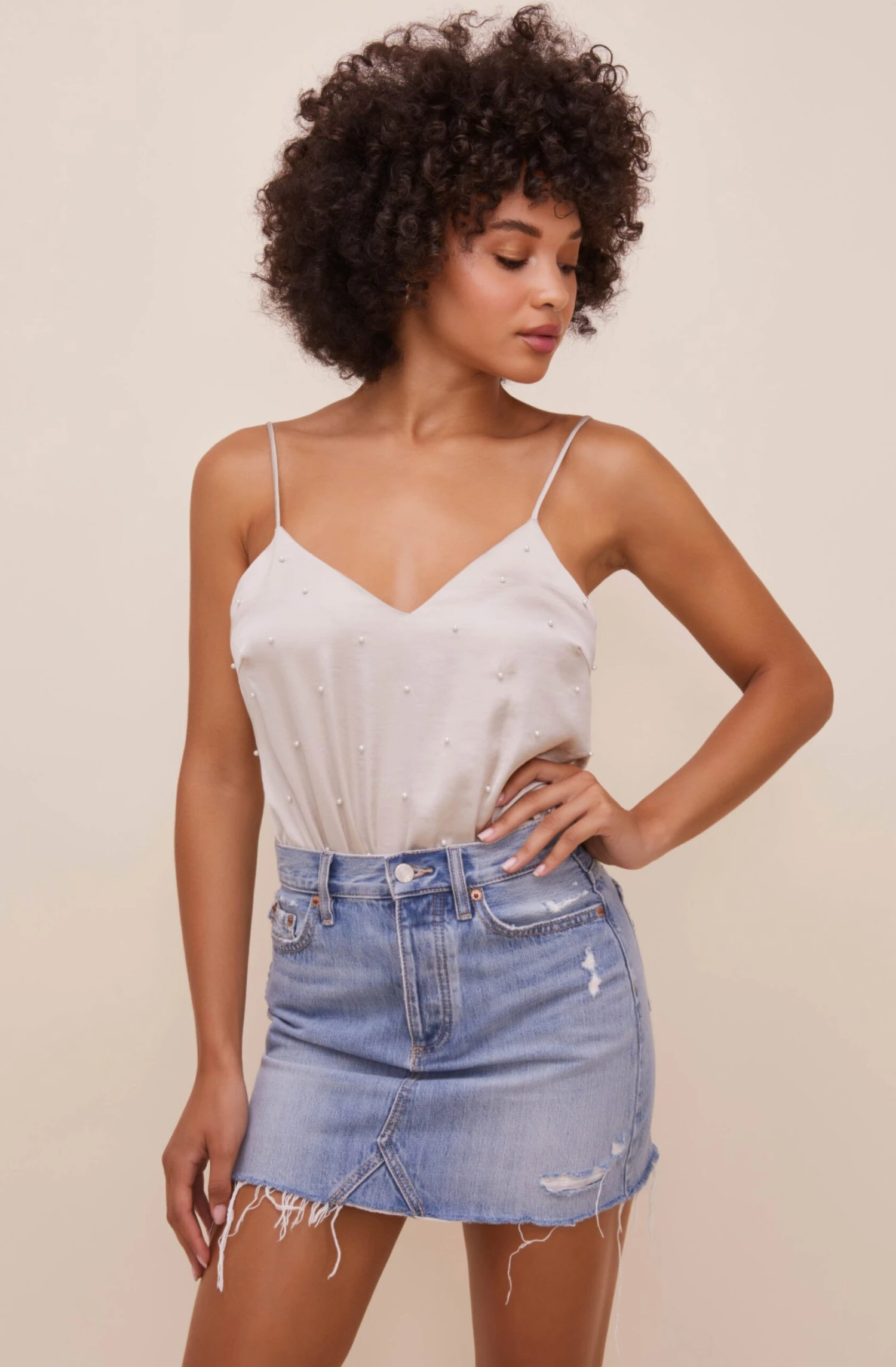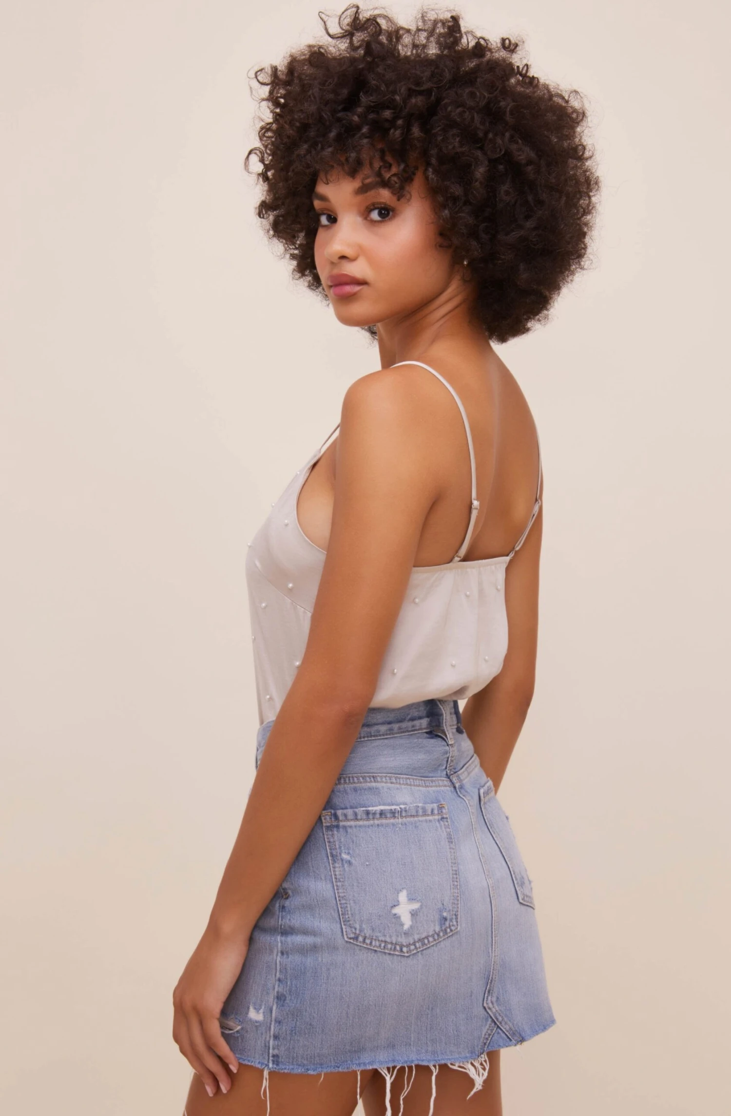Look no further. This satin bodysuit features a V neckline supported by delicate straps. Faux pearl embellishments throughout. Attached bottoms with snap button closures.