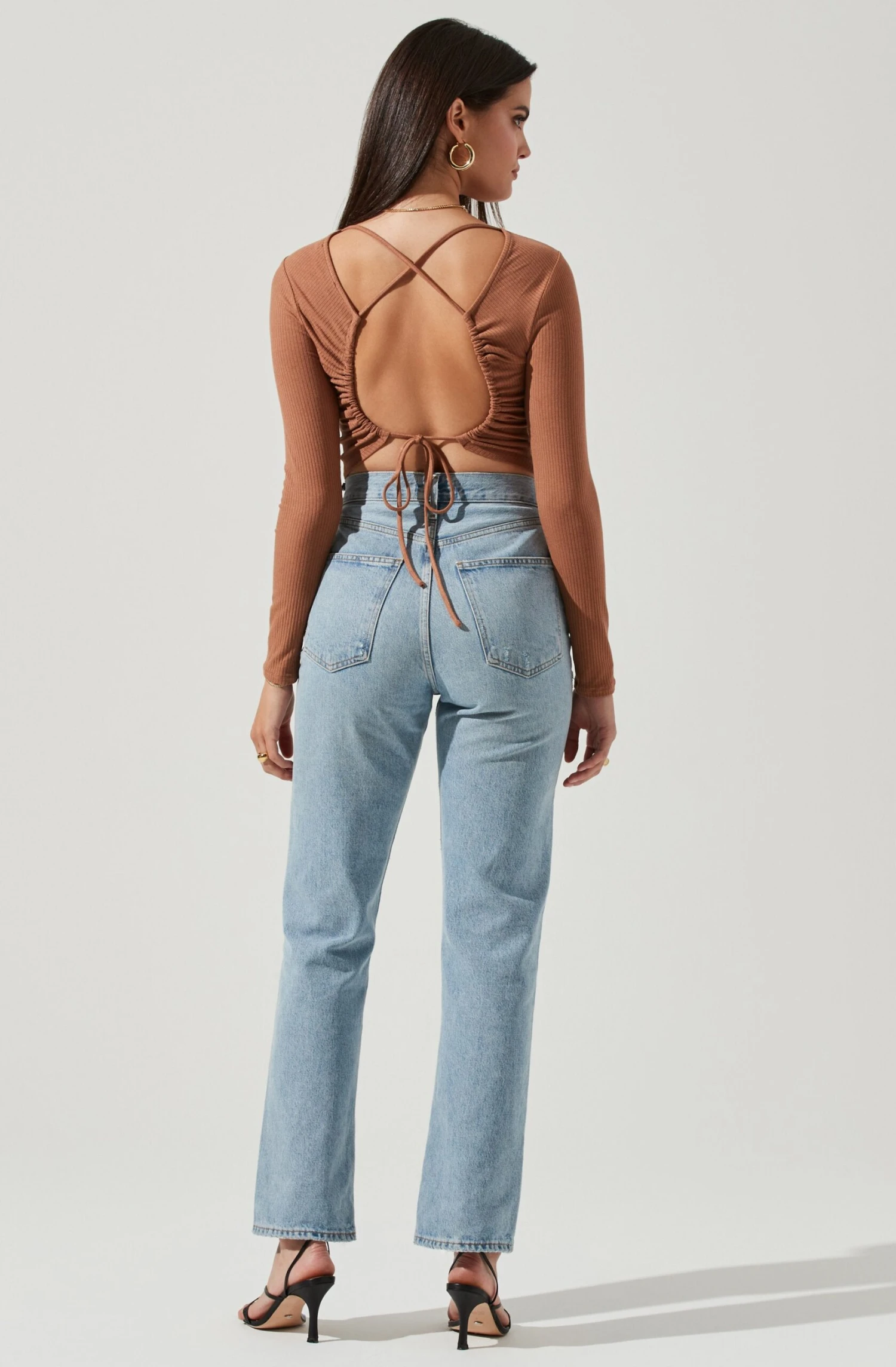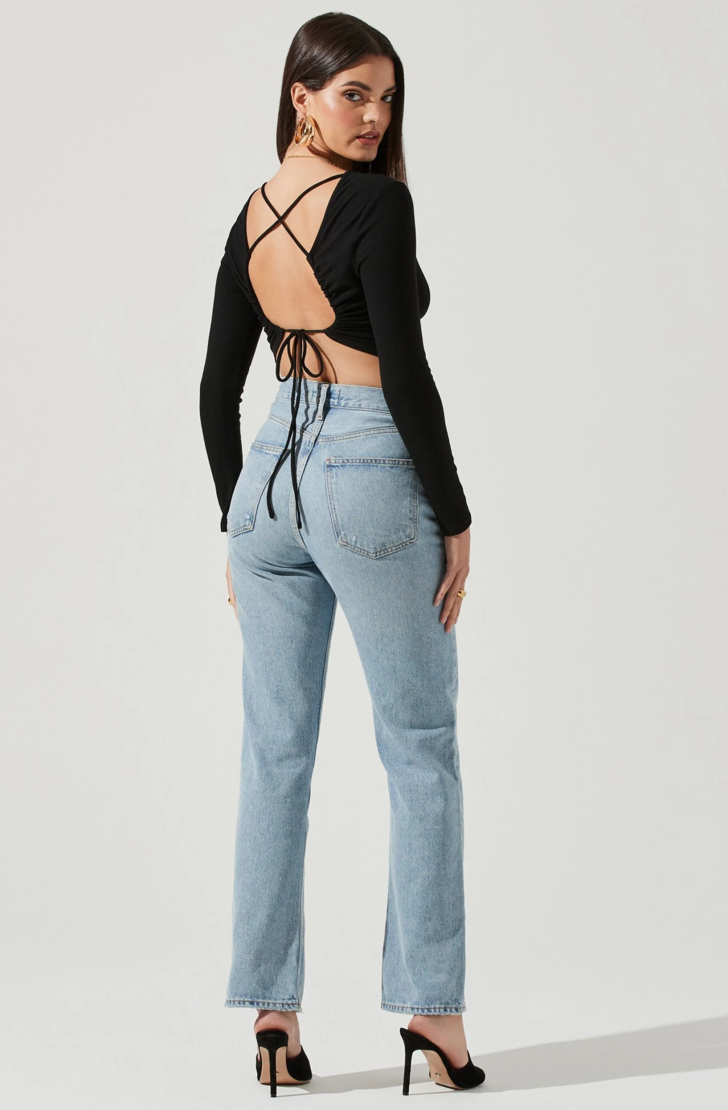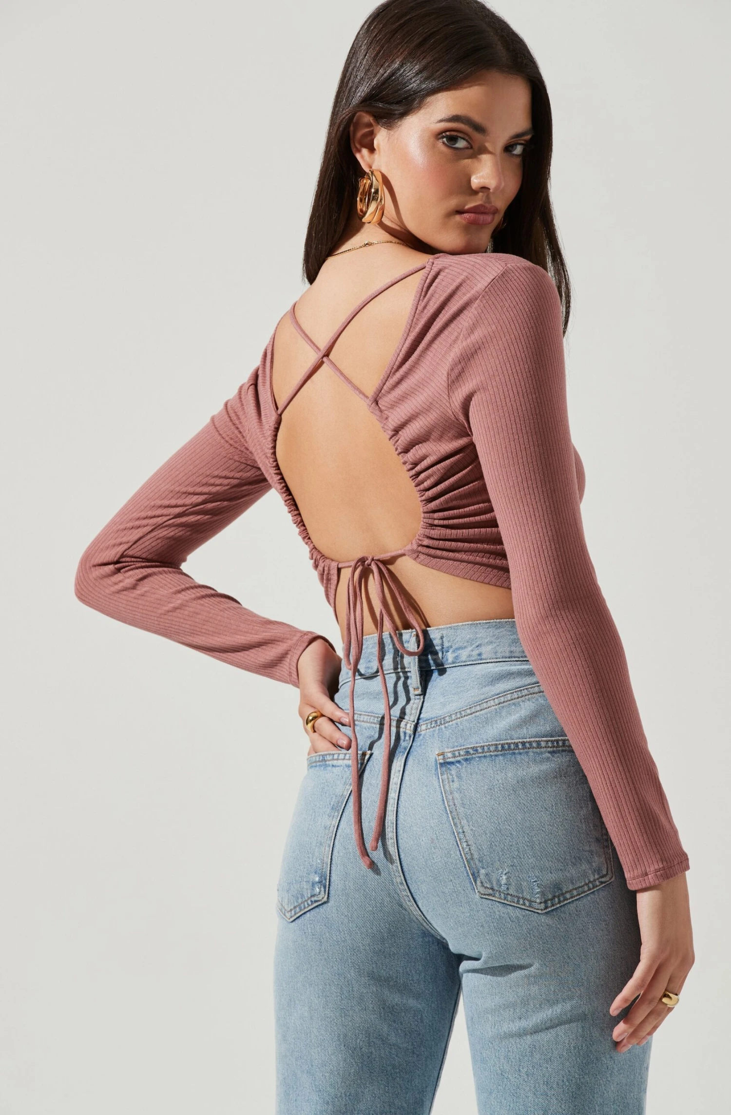 The Toluca Top features a cutout back with a cross strap back and tie straps. Long sleeves. Cropped.