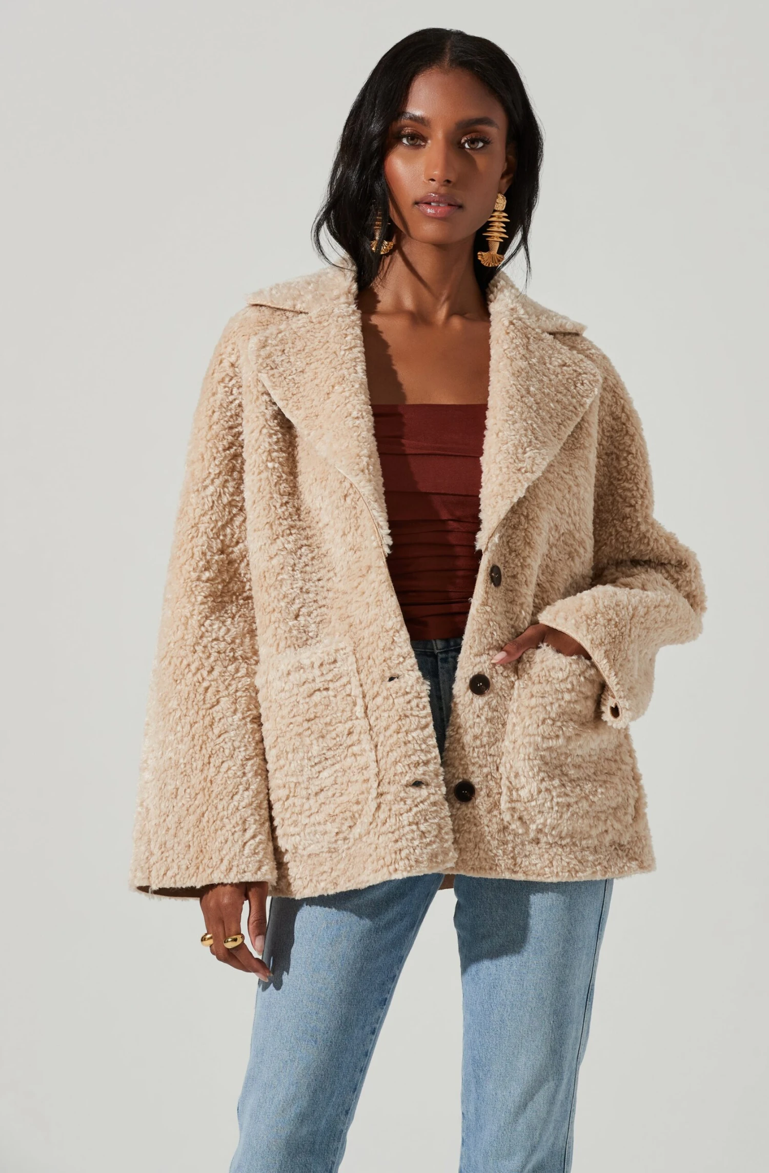 This cropped coat features a faux shearling construction for the coziest of fits. Oversized, notched lapel leads to a buttoned front with statement patch pockets on the side. Long sleeves.