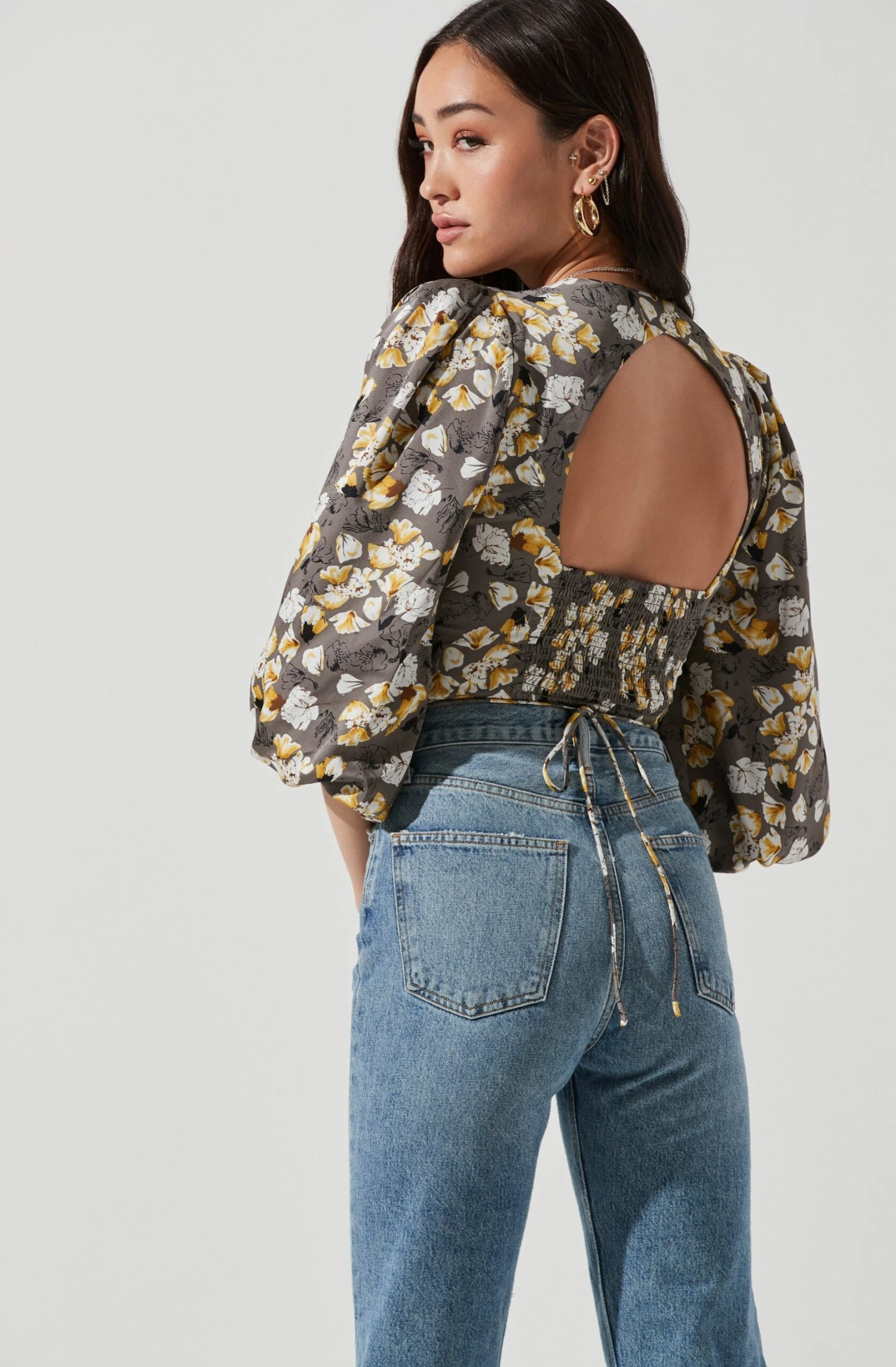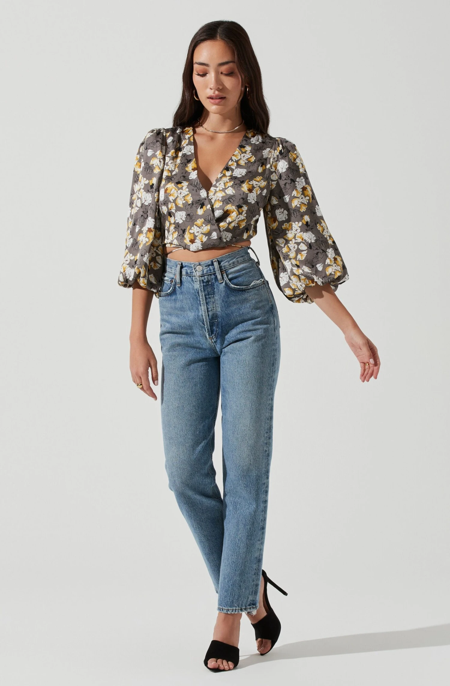 A total outfit-making top! It features a plunge neckline that leads to a wrapped front and tying straps at the waist. Balloon sleeves. Open back.